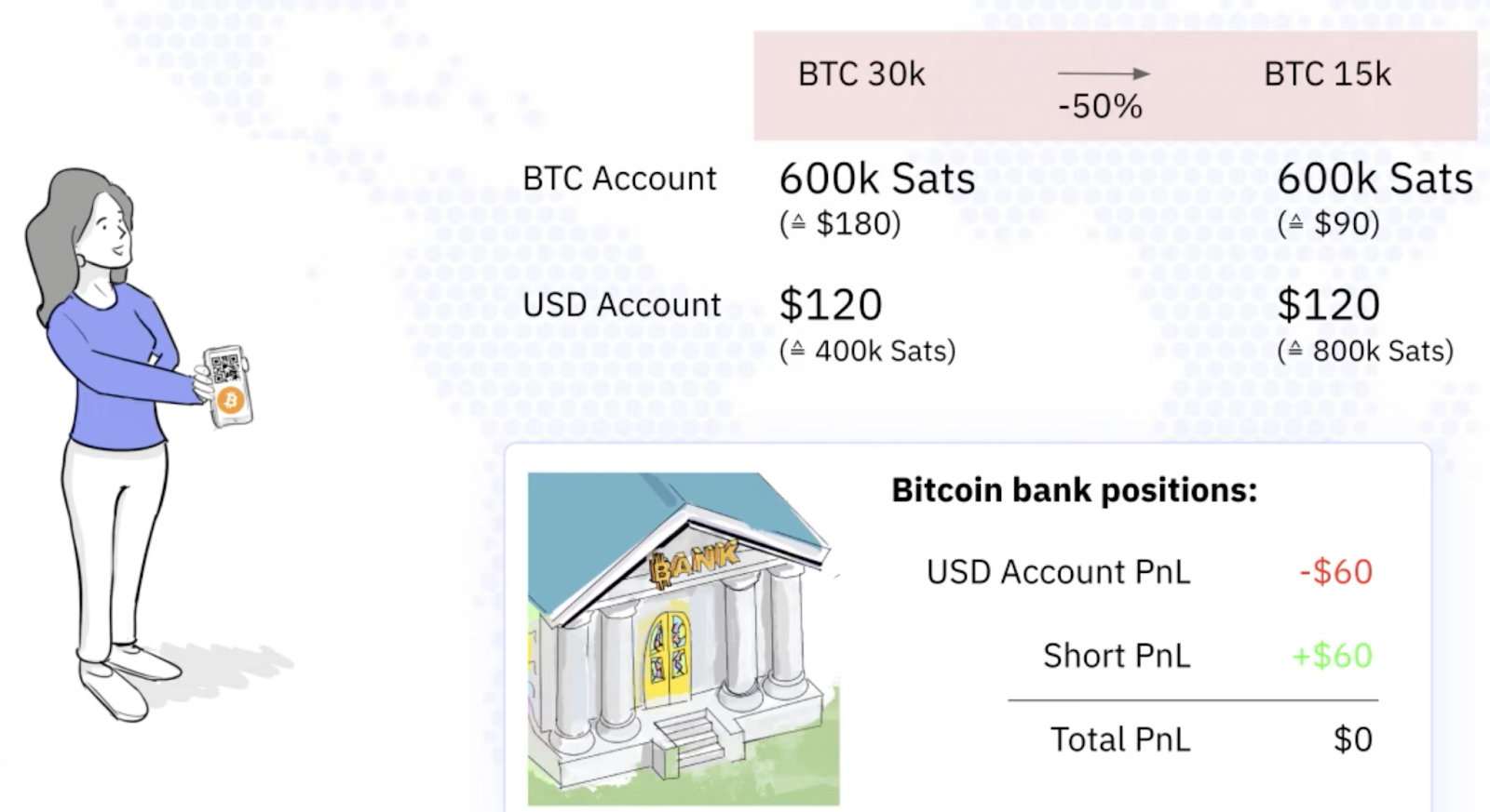 - 예) 사용자가 라이트닝 네트워크 지갑에서 1 BTC를 USD 잔액으로 전환했다고 가정해 보겠습니다. 1 BTC는 해당 금액만큼의 역 무기한 스왑 계약을 구매하기 위해 약정됩니다. 1 BTC가 20,000달러에 해당한다면, 1달러씩 20,000개의 계약을 의미하게 됩니다. 비트코인 가격이 두 배 또는 절반으로 떨어지면 손익은 실현되지 않고 기본 역 무기한 스왑 계약에 따라 20,000달러의 금액이 여전히 표시됩니다.