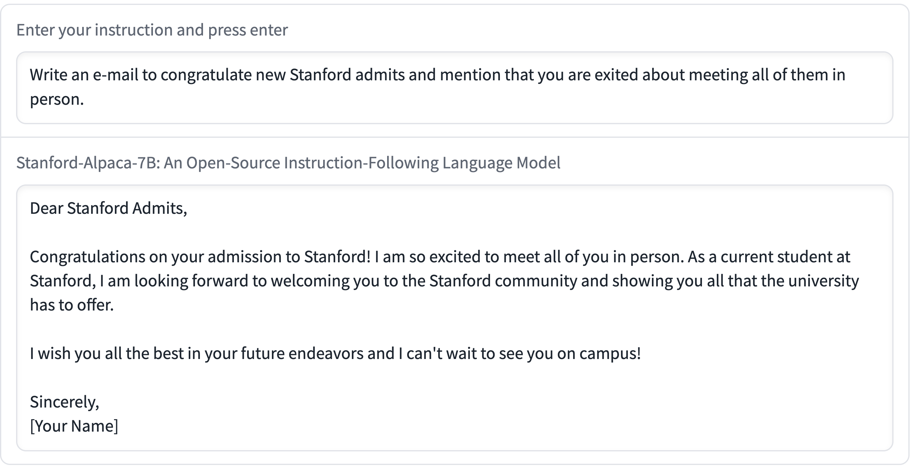 We introduce Alpaca 7B, a model fine-tuned from the LLaMA 7B model on 52K instruction-following demonstrations. Alpaca behaves similarly to OpenAI’s text-davinci-003, while being surprisingly small and easy/cheap to reproduce (<$600). Web Demo GitHub