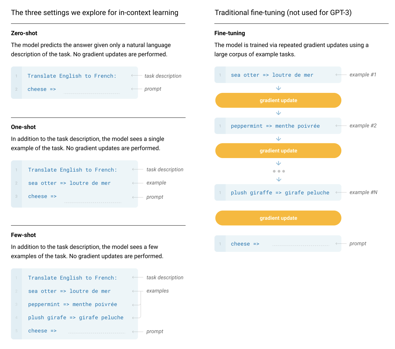 2020년 OpenAI는 이전 언어 모델보다 10배 많은 1,750억 개의 파라미터를 갖춘 생성 언어 모델인 GPT-3를 발표하고 NLP 벤치마크에서 그 성능을 공개했습니다. 하지만 단순히 규모만 업그레이드한 것이 아닙니다. GPT-3는 텍스트 상호 작용만으로 작업을 처리할 수 있는 향상된 기능을 보여주었습니다. 이러한 작업에는 제로 샷, 원샷, 소수 샷 학습이 포함되며, 모델에 작업 정의 및/또는 몇 가지 예제가 주어지고 추가 교육 없이 작업을 수행해야 합니다. 즉, 파인 튜닝이 사용되지 않습니다. 마치 사람이 간단한 명령어의 몇 가지 예제만 보고 새로운 언어 작업을 수행하는 것과 같습니다. 하지만 어떤 경우에는 GPT-3의 성능이 SOTA(최첨단) 원튜닝 시스템의 성능과 거의 일치하기도 합니다.