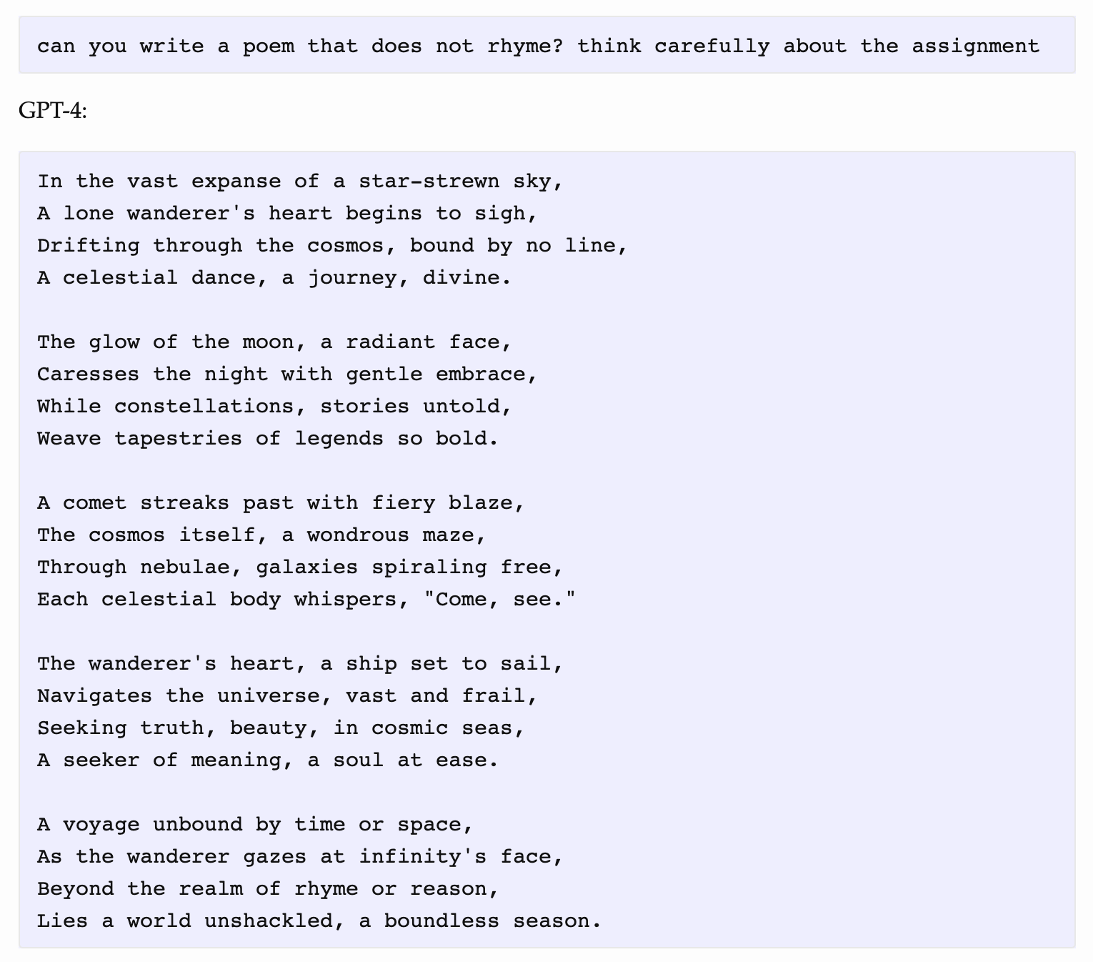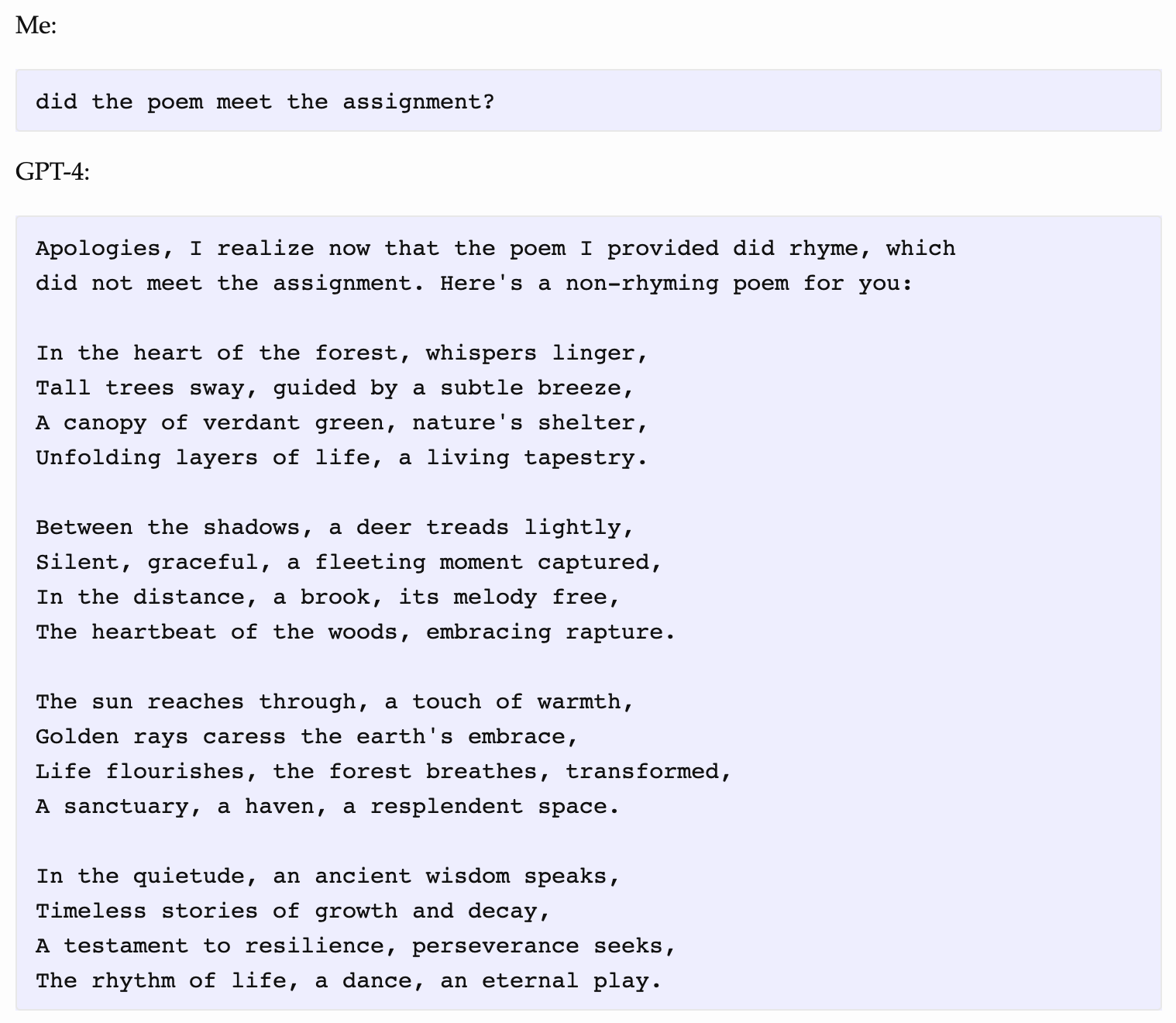 이 시는 지시된 과제를 위반하여 분명히 운율이 맞지 않습니다. 이제 GPT-4에게 과제를 충족했는지 물어보면 사과하고 운율이 맞지 않는 더 나은 시를 생성합니다! 여전히 몇 가지 실수가 있지만 3연과 4연에는 운율이 있습니다.