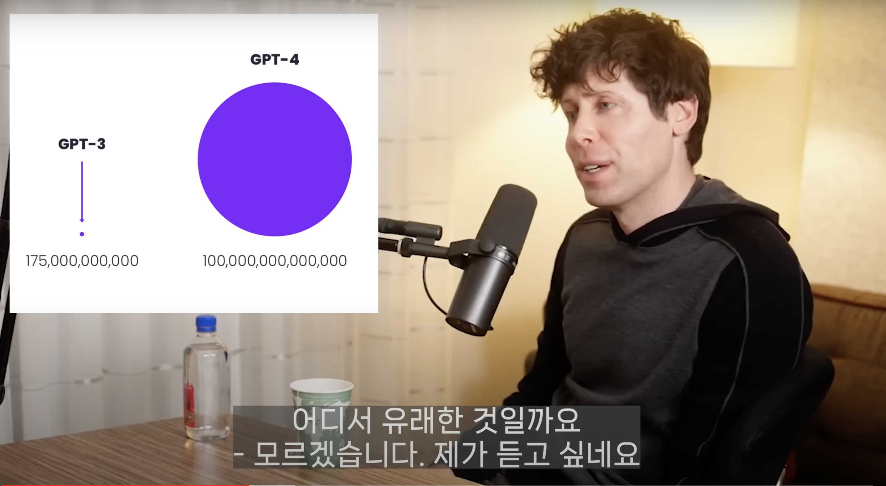 GPT-3 파라미터 개수가 175B (천칠백오십억) 이라고 알려져 있습니다. 그러나 최근 공개된 GPT-4 파라미터 개수는 공식적으로 공개되지 않았습니다. 그럼에도, 1T (백조개) 라는 루머가 돌았습니다. GPT를 만든 오픈 API 샘 알트먼도 이 개수가 어디서 유래한 것인지 궁금했는데요. 뜻 밖에도, 렉스 프리드먼과의 인터뷰에서 밝혀졌습니다. 루머의 진원지는 렉스 프리드먼이었습니다.