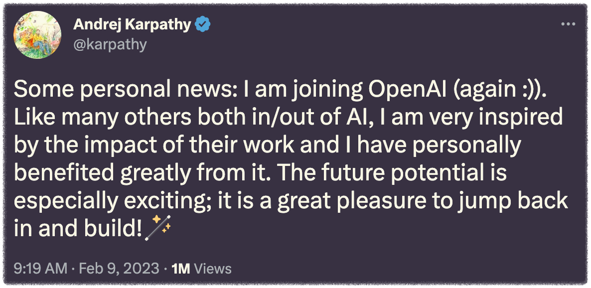 존경하는 "안드레 카파씨"가 OpenAI에 재입사했다. (2023.2.9)