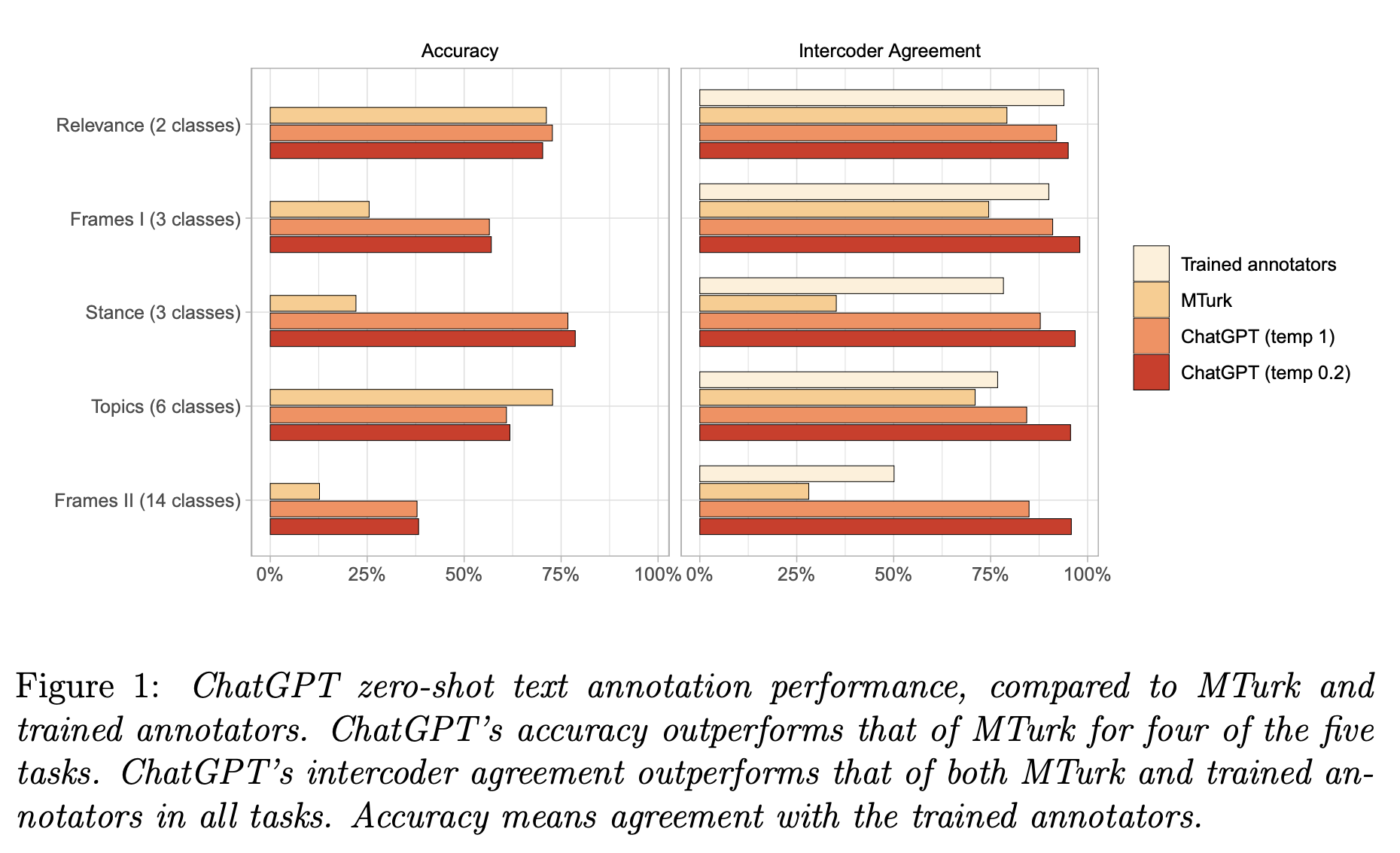 많은 NLP 애플리케이션은 다양한 작업을 위해 수동 데이터 주석을 필요로 합니다. 특히 분류기를 훈련하거나 비지도 모델의 성능을 평가하기 위해 수동 데이터 주석을 필요로 합니다. 복잡성의 규모와 정도에 따라 다음과 같은 방법으로 작업을 수행할 수 있습니다. MTurk와 같은 플랫폼의 크라우드 워커와 다음과 같은 숙련된 어노테이터가 수행할 수 있습니다. 연구 조교. 2,382개의 트윗 샘플을 사용해 ChatGPT가 관련성, 입장, 프레임 감지 등 여러 주석 작업에서 크라우드 워커보다 성능이 뛰어남을 보여줍니다. 토픽 및 프레임 감지, 특히, ChatGPT의 제로 샷 정확도의 제로 샷 정확도는 5개 작업 중 4개 작업에서 크라우드 워커의 정확도를 능가하며, ChatGPT의 인터코더 합의는 모든 작업에서 크라우드 워커와 숙련된 주석가 모두의 합의보다 높았습니다. 게다가 ChatGPT의 주석당 비용은 0.003달러 미만으로 MTurk보다 약 20배나 낮습니다. 이러한 결과는 대규모 언어의 잠재력을 보여줍니다. 모델이 텍스트 분류의 효율성을 획기적으로 높일 수 있다는 가능성을 보여줍니다.